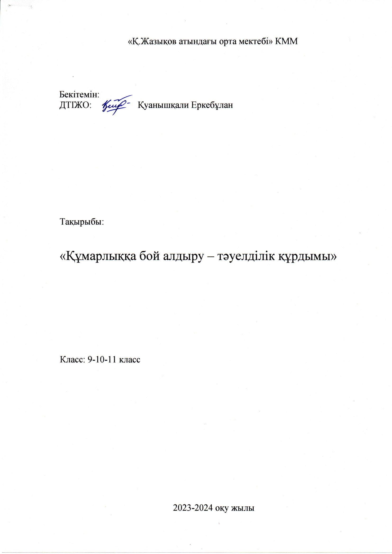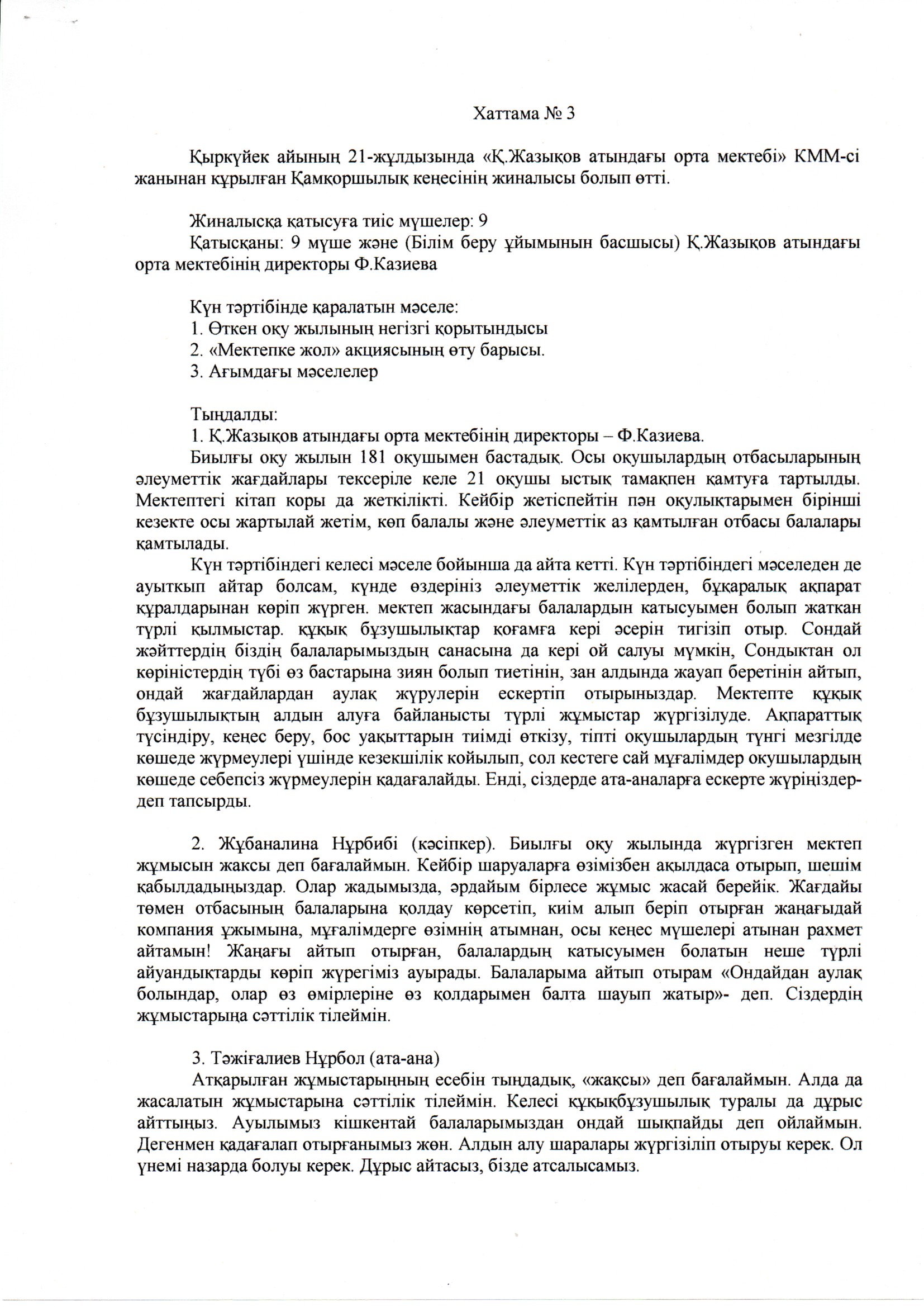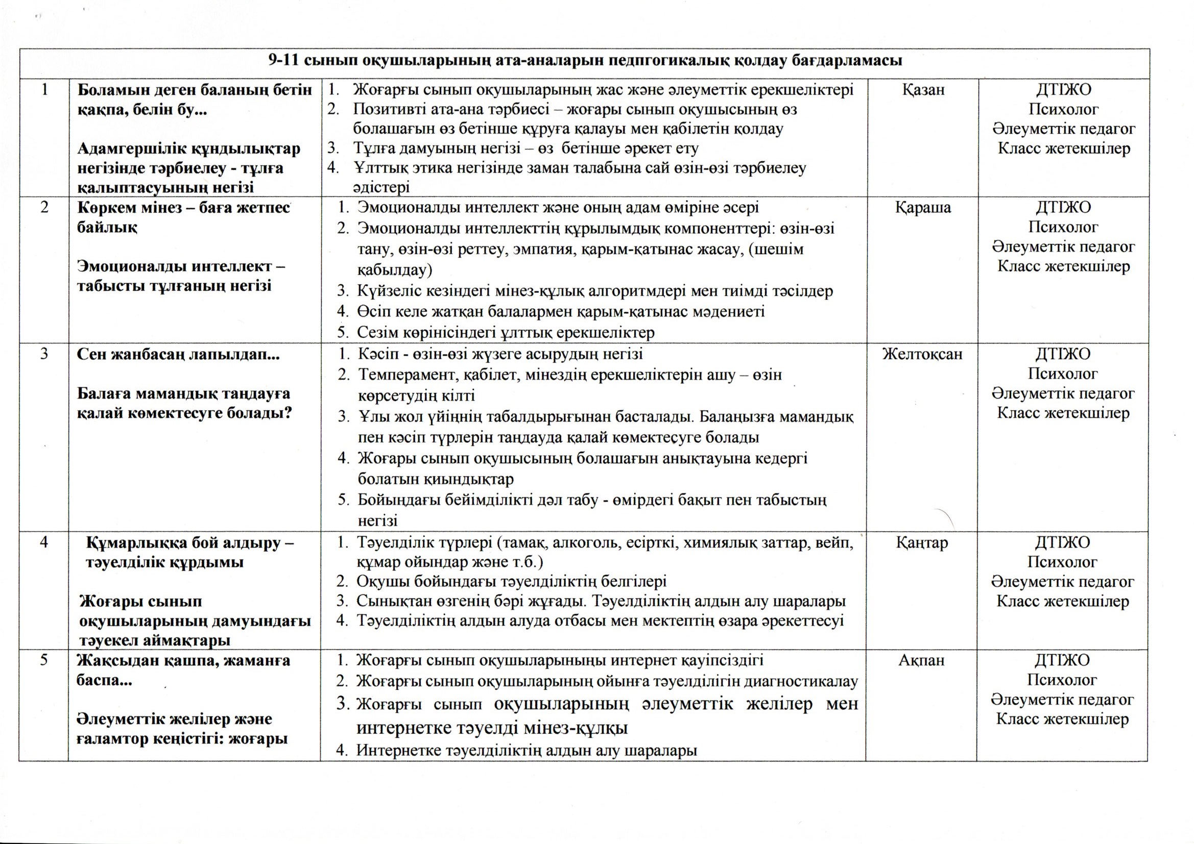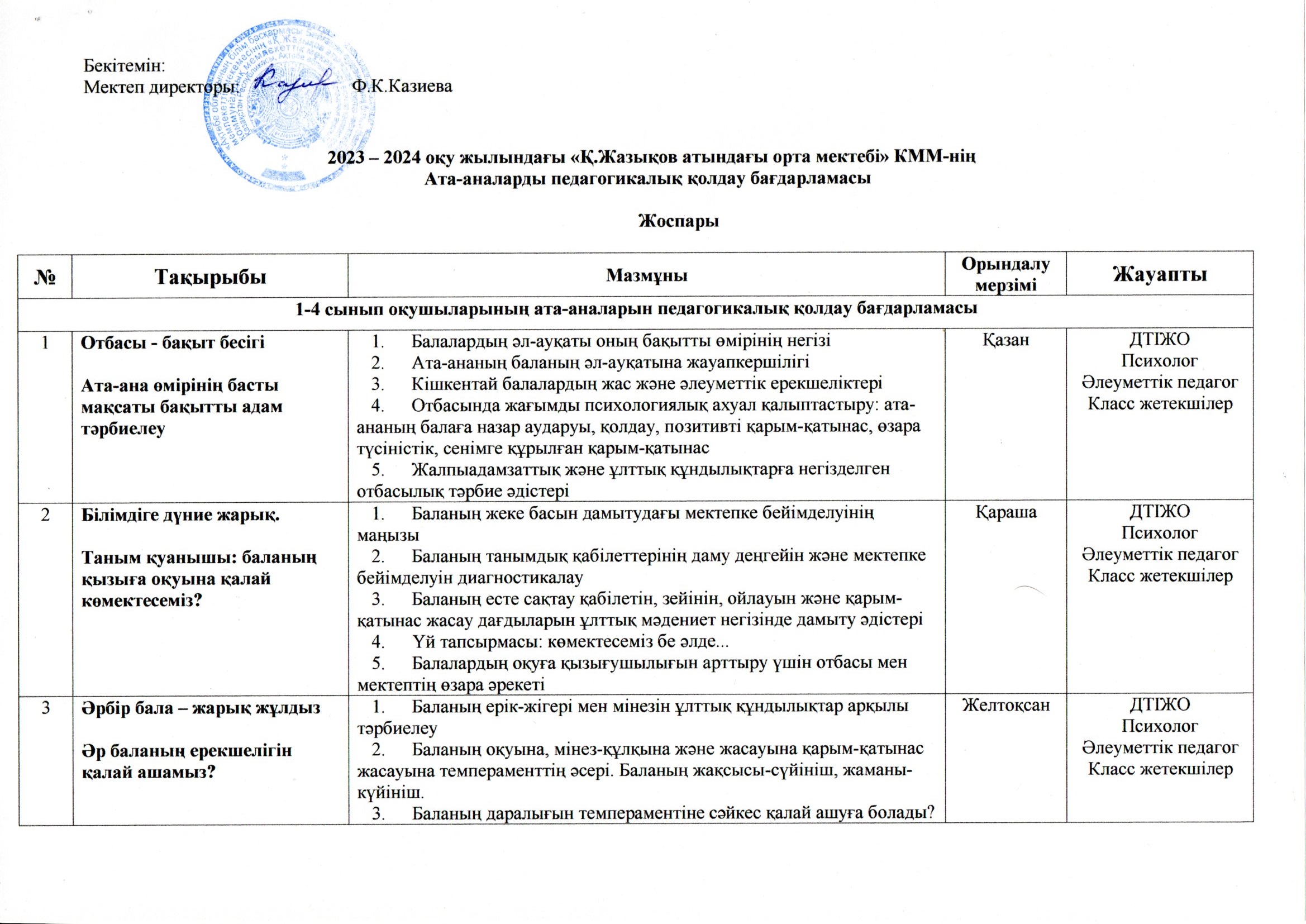 Қ.Жазықов атындағы орта мектебінде позитивті ата-ана мәдениетін қалыптастыру және өскелең ұрпақты тәрбиелеудің өзекті мәселелерін шешу үшін аға буынның тәжірибесін табысты пайдалану мақсатында «Ата-аналарды педагогикалық қолдау орталығы» кабинетінің ашылу салтанаты өтті. Осы кабинеттің жұмысы «Даналық мектебі» клубы білім беру ұйымының нақты қажеттіліктерін және ата-аналар қоғамы өкілдерінің өскелең ұрпақты тәрбиелеуде халықтың ұлттық құндылықтары мен педагогикалық дәстүрлерін қолданудың оң тәжірибесімен бөлісуге бағытталады. «Даналық мектебі» қызметінің басым бағыты – ата-аналар қауымымен жұмыс болып табылады. Клуб мектептің нақты сұраныстары мен талаптарына сәйкес, «Ата өсиеті», «Әже даналығы», «Аға қамқорлығы», «Жеңге кеңесі» клубтары ұйымдастырылды. «Даналық мектебі» клубы қызметінің мақсаты – аға буынның педагогикалық әлеуетін өзектендіру арқылы ата-аналардың позитивті мәдениетін дамытуға жәрдемдесу.